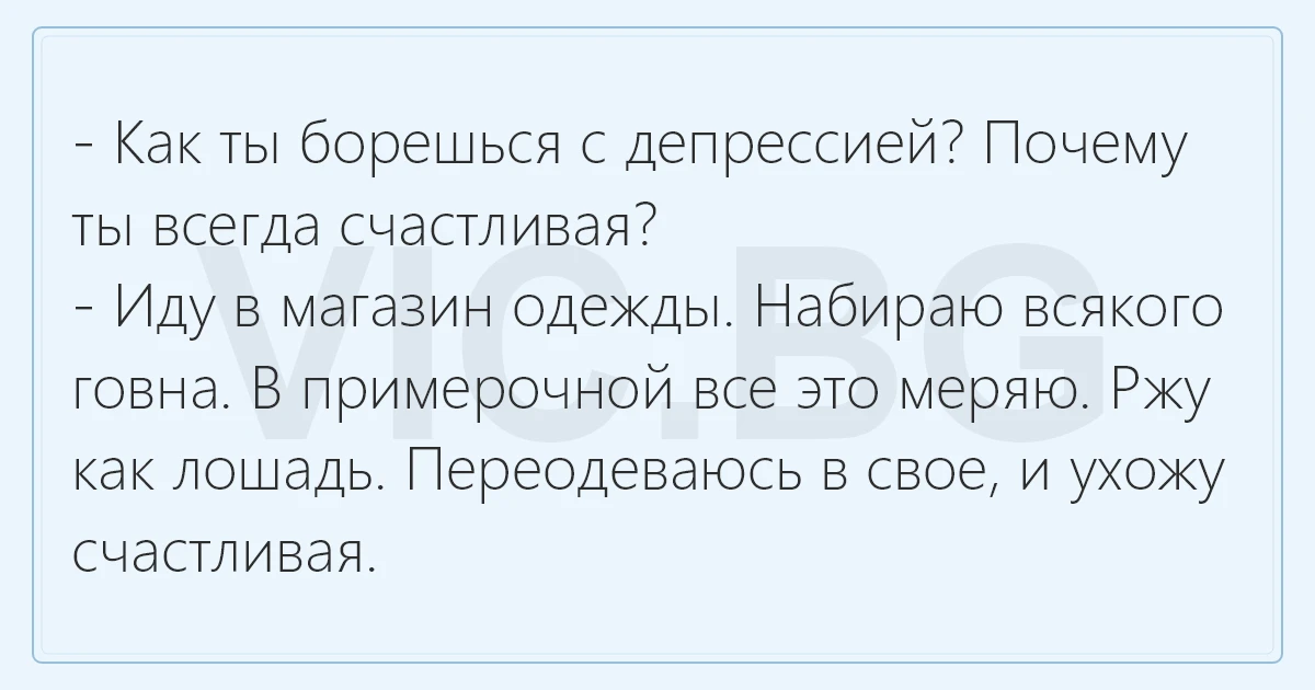 - Как ты борешься с депрессией? Почему ты всегда счастливая? - Иду в магазин одежды. Набираю всякого говна. В примерочной все это меряю. Ржу как лошадь. Переодеваюсь в свое, и ухожу счастливая.