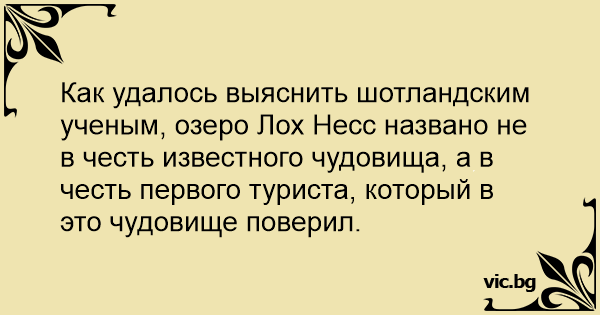 Как удалось выяснить шотландским ученым, озеро Лох Несс названо не в честь известного чудовища, а в честь первого туриста, который в это чудовище поверил.