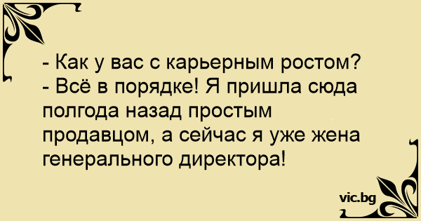 - Всё в порядке! Я пришла сюда полгода назад простым продавцом, а сейчас я уже жена генерального директора!