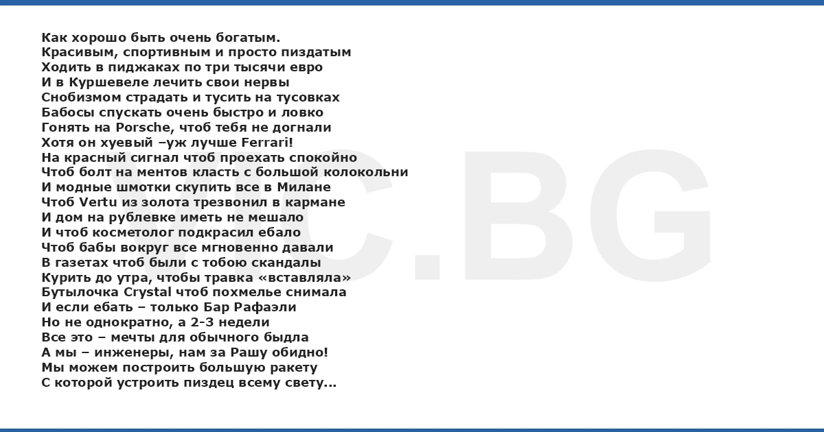 Как хорошо быть очень богатым. Красивым, спортивным и просто пиздатым Ходить в пиджаках по три тысячи евро И в Куршевеле лечить свои нервы Снобизмом страдать и тусить на тусовках Бабосы спускать очень быстро и ловко Гонять на Porsche, чтоб тебя не догнали Хотя он хуевый –уж лучше Ferrari! На красный сигнал чтоб проехать спокойно Чтоб болт на ментов класть с большой колокольни И модные шмотки скупить все в Милане Чтоб Vertu из золота трезвонил в кармане И дом на рублевке иметь не мешало И чтоб косметолог подкрасил ебало Чтоб бабы вокруг все мгновенно давали В газетах чтоб были с тобою скандалы Курить до утра, чтобы травка «вставляла» Бутылочка Crystal чтоб похмелье снимала И если eбatь – только Бар Рафаэли Но не однократно, а 2-3 недели Все это – мечты для обычного быдла А мы – инженеры, нам за Рашу обидно! Мы можем построить большую ракету С которой устроить пиздeц всему свету Ведь 250 килотонн в ней тротила И срут кирпичами от страха мудилы! На самом ведь деле круты не мажоры И не киношные «мадамы-сеньоры» Все лидеры партий круты понарошку Нефтяные магнаты – ну может немножко Певцы и певички ну просто достали А юмористы – ну вообще заебали! Круты в самом деле не эти придурки. Круты инженеры и нейрохирурги Конструкторы танков, офицеры спецназа Учителя, снайперы, скалолазы Крут также летчик, пожарный, спасатель Крут гомофоб – пидорасов каратель Крут и строитель, и чумазый шахтер Крут у ракеты ударной вахтер А те, что по телеку часто мелькают О крутости, блджад, ничего и не знают Такая вот правда известна народу А кто не согласен – тот пусть идет в жопу!