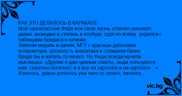 КАК ЭТО ДЕЛАЛОСЬ В КАРАКАСЕ Мой одноклассник Федя всю свою жизнь отлично умножал, делил, возводил в степень и вообще, судя по всему, родился с таблицами Брадиса в кулачке.