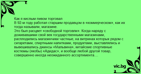 Ну, допродали мы предыдущую партию, и я начал выносить из подсобки в торговый зал первые из этих двадцати ящиков, а моя коллега-девушка тут же продала из этих ящиков первую бутылку похмельному мужику. Я ещё таскаю, когда он возвращается с початой бутылкой, и заявляет, что пиво прокисшее. Говорит: «На – сам попробуй!»