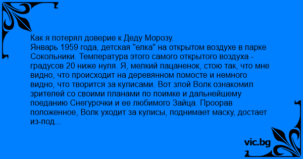 Как я потерял доверие к Деду Морозу. Январь 1959 года, детская "елка" на открытом воздухе в парке Сокольники. Температура этого самого открытого воздуха - градусов 20 ниже нуля. Я, мелкий пацаненок, стою так, что мне видно, что происходит на деревянном помосте и немного видно, что творится за кулисами. Вот злой Волк ознакомил зрителей со своими планами по поимке и дальнейшему поеданию Снегурочки и ее любимого Зайца. Проорав положенное, Волк уходит за кулисы, поднимает маску, достает из-под шкуры четвертинку водки и делает хороший глоток. Ну, воспринимаю как должное. Волк плохой, он еще не то может себе позволить. Но когда волчара протягивает четвертинку подошедшему Деду Морозу, а тот с благодарностью "добивает" остаток, моя система ценностей начинает стремительно рушиться. Я рыдаю и тяну отца прочь от этого страшного места. С тех пор на протяжении нескольких лет новогодние подарки я получал только от Снегурочки...