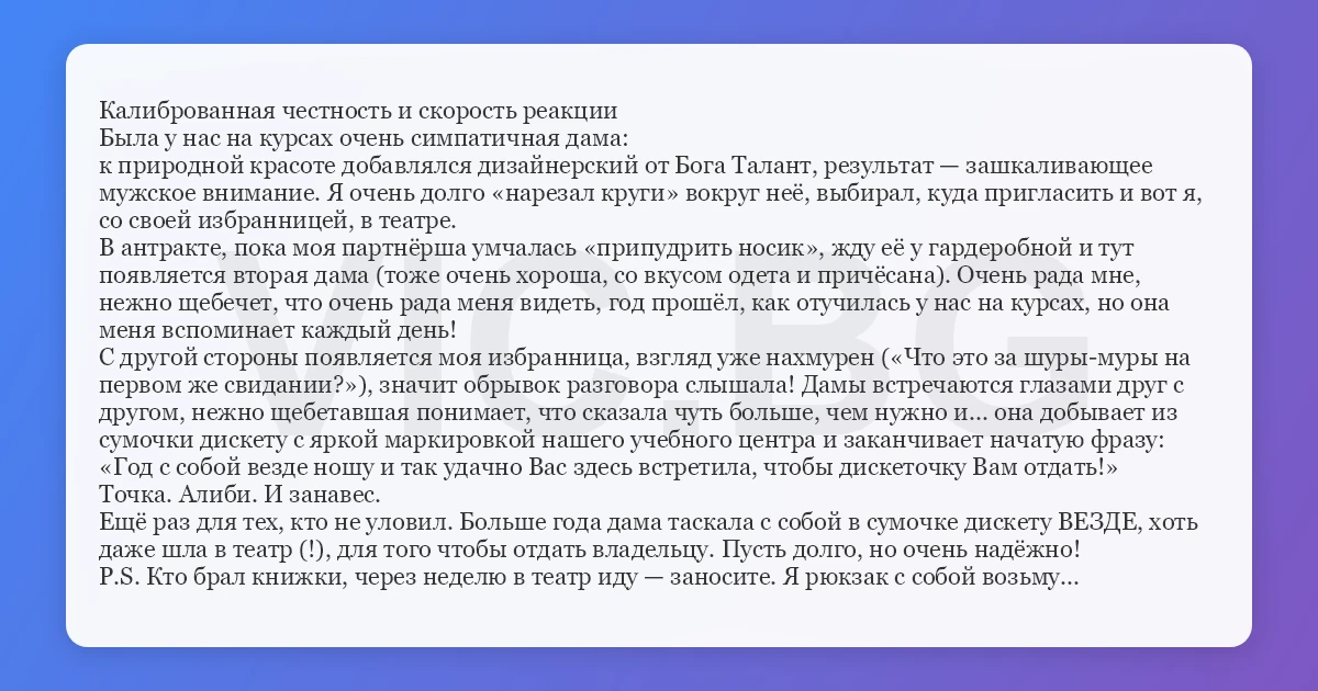 Калиброванная честность и скорость реакции Была у нас на курсах очень симпатичная дама: к природной красоте добавлялся дизайнерский от Бога Талант, результат — зашкаливающее мужское внимание. Я очень долго «нарезал круги» вокруг неё, выбирал, куда пригласить и вот я, со своей избранницей, в театре. В антракте, пока моя партнёрша умчалась «припудрить носик», жду её у гардеробной и тут появляется вторая дама (тоже очень хороша, со вкусом одета и причёсана). Очень рада мне, нежно щебечет, что очень рада меня видеть, год прошёл, как отучилась у нас на курсах, но она меня вспоминает каждый день! С другой стороны появляется моя избранница, взгляд уже нахмурен («Что это за шуры-муры на первом же свидании?»), значит обрывок разговора слышала! Дамы встречаются глазами друг с другом, нежно щебетавшая понимает, что сказала чуть больше, чем нужно и... она добывает из сумочки дискету с яркой маркировкой нашего учебного центра и заканчивает начатую фразу: «Год с собой везде ношу и так удачно Вас здесь встретила, чтобы дискеточку Вам отдать!» Точка. Алиби. И занавес. Ещё раз для тех, кто не уловил. Больше года дама таскала с собой в сумочке дискету ВЕЗДЕ, хоть даже шла в театр (!), для того чтобы отдать владельцу. Пусть долго, но очень надёжно! P.S. Кто брал книжки, через неделю в театр иду — заносите. Я рюкзак с собой возьму...