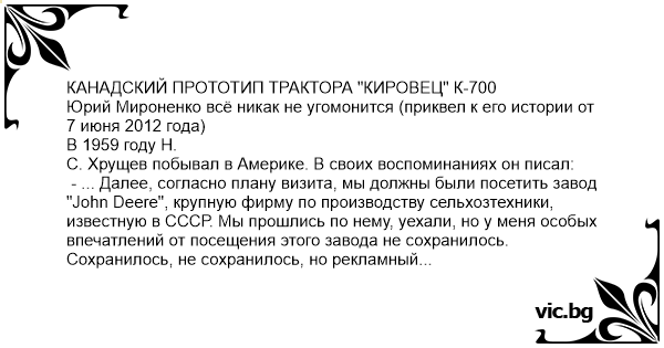 КАНАДСКИЙ ПРОТОТИП ТРАКТОРА "КИРОВЕЦ" К-700 Юрий Мироненко всё никак не угомонится (приквел к его истории от 7 июня 2012 года) В 1959 году Н. С. Хрущев побывал в Америке. В своих воспоминаниях он писал: - ... Далее, согласно плану визита, мы должны были посетить завод "John Deere", крупную фирму по производству сельхозтехники, известную в СССР. Мы прошлись по нему, уехали, но у меня особых впечатлений от посещения этого завода не сохранилось. Сохранилось, не сохранилось, но рекламный буклет тракторов Джон Дир он оттуда прихватил. Вскоре по приезду было принято решение Госкомитета Совета министров СССР по оборонной технике о безотлагательном создании аналогичного трактора для сельских и прочих нужд. Но как раз в это время отношения с США снова стали портиться, и в продаже John Deere, так понравившемуся Никите Сергеевичу, был получен категорический отказ. Но, к счастью, спустя несколько месяцев через Швецию удалось приобрести нечто похожее на рекламку, а именно канадский трактор фирмы "Wagner". Этот трактор доставили на "Кировский завод", аккуратно распаковали и поставили под окнами кабинета Генерального директора. ... Трактор надо было для начала хотя бы завести. Первое, что сразу бросилось в глаза после осмотра, было отсутствие приборной панели и замка зажигания. В кабине имелись в наличии:, рычаги, руль, педали и одна торчащая кнопка. Инженер отдела испытаний Миша Ваксельман нажал на эту кнопку, и она осталась в полуутопленном состоянии. Он потянул её на себя и вынул прикуриватель. После этого в кабину импортного трактора залез заместитель главного конструктора и заявил: - Это - кнопка стартёра, сейчас мы его заведём! Ну а дальше - кнопка была утоплена, затем выдернута и с матюгами брошена на пол кабины. Далее зам.главного конструктора с указательным пальцем, засунутым в рот, был препровождён в медпункт. Красивая и гладкая наружная панель с отверстием для прикуривателя оказалась технологической транспортной накладкой для защиты приборной доски, и после её снятия завести трактор не составило никакого труда.