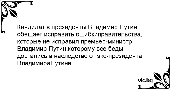 Кандидат в президенты Владимир Путин обещает исправить ошибкиправительства, которые не исправил премьер-министр Владимир Путин,которому все беды достались в наследство от экс-президента ВладимираПутина.