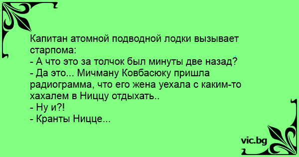 - Да это... Мичману Ковбасюку пришла радиограмма, что его жена уехала с каким-то хахалем в Ниццу отдыхать..