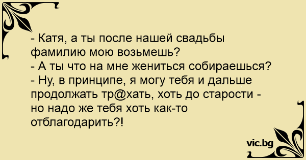 - Катя, а ты после нашей свадьбы фамилию мою возьмешь?<br />- А ты что на мне жениться собираешься?<br />- Ну, в принципе, я могу тебя и дальше продолжать тр@хать, хоть до старости - но надо же тебя хоть как-то отблагодарить?!