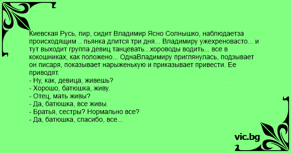 Киевская Русь, пир, сидит Владимир Ясно Солнышко, наблюдаетза происходящим .. пьянка длится три дня... Владимиру ужеxpеновасто... и тут выходит группа девиц танцевать...хороводы водить... все в кокошниках, как положено... ОднаВладимиру приглянулась, подзывает он писаря, показывает нарыженькую и приказывает привести. Ее приводят.