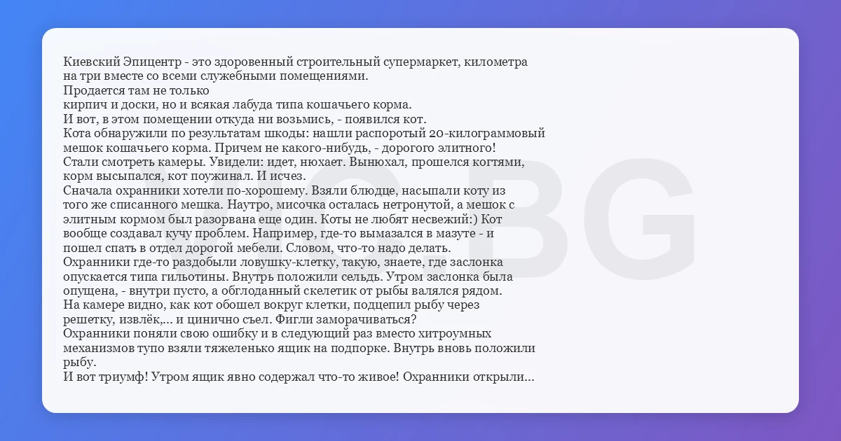 Киевский Эпицентр - это здоровенный строительный супермаркет, километра на три вместе со всеми служебными помещениями. Продается там не только кирпич и доски, но и всякая лабуда типа кошачьего корма. И вот, в этом помещении откуда ни возьмись, - появился кот. Кота обнаружили по результатам шкоды: нашли распоротый 20-килограммовый мешок кошачьего корма. Причем не какого-нибудь, - дорогого элитного! Стали смотреть камеры. Увидели: идет, нюхает. Вынюхал, прошелся когтями, корм высыпался, кот поужинал. И исчез. Сначала охранники хотели по-хорошему. Взяли блюдце, насыпали коту из того же списанного мешка. Наутро, мисочка осталась нетронутой, а мешок с элитным кормом был разорвана еще один. Коты не любят несвежий:) Кот вообще создавал кучу проблем. Например, где-то вымазался в мазуте - и пошел спать в отдел дорогой мебели. Словом, что-то надо делать. Охранники где-то раздобыли ловушку-клетку, такую, знаете, где заслонка опускается типа гильотины. Внутрь положили сельдь. Утром заслонка была опущена, - внутри пусто, а обглоданный скелетик от рыбы валялся рядом. На камере видно, как кот обошел вокруг клетки, подцепил рыбу через решетку, извлёк,... и цинично съел. Фигли заморачиваться? Охранники поняли свою ошибку и в следующий раз вместо хитроумных механизмов тупо взяли тяжеленько ящик на подпорке. Внутрь вновь положили рыбу. И вот триумф! Утром ящик явно содержал что-то живое! Охранники открыли его…. и внутри Да!!! - был - таки кот!!! Но это был… НЕ ТОТ кот:-(((
