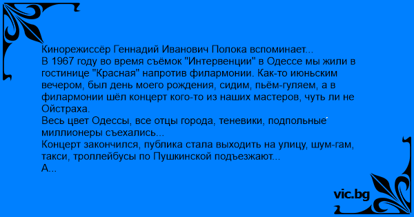 В 1967 году во время съёмок "Интервенции" в Одессе мы жили в гостинице "Красная" напротив филармонии. Как-то июньским вечером, был день моего рождения, сидим, пьём-гуляем, а в филармонии шёл концерт кого-то из наших мастеров, чуть ли не Ойстраха.
