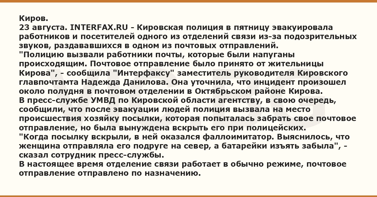 23 августа. INTERFAX.RU - Кировская полиция в пятницу эвакуировала работников и посетителей одного из отделений связи из-за подозрительных звуков, раздававшихся в одном из почтовых отправлений.