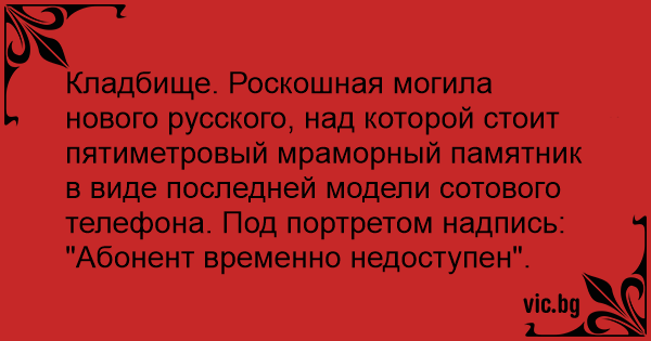 Кладбище. Роскошная могила нового русского, над которой стоит пятиметровый мраморный памятник в виде последней модели сотового телефона. Под портретом надпись: "Абонент временно недоступен".