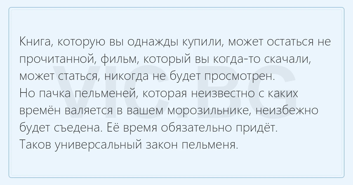 Книга, которую вы однажды купили, может остаться не прочитанной, фильм, который вы когда-то скачали, может статься, никогда не будет просмотрен. Но пачка пельменей, которая неизвестно с каких времён валяется в вашем морозильнике, неизбежно будет съедена. Её время обязательно придёт. Таков универсальный закон пельменя.