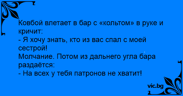 П'яний ковбой заходить до переповненого салуну і, розмахуючи кольтом, кричить: "Отже, признавайтесь, хто з вас переспав з моєю дружиною, поки я пас ваших корів, пристрелю кожного!" Всі намагаються...