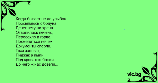 Когда бывает не до улыбок. Просыпаюсь с бодуна. Денег нету ни хpeнa. Отвалилась печень, Пересохло в горле, Похмелиться нечем, Документы сперли, Глаз заплыл, Пиджак в пыли, Под кроватью брюки. До чего ж нас довели Коммунисты-суки. Игорь Иртеньев. С одним моим знакомым, по фамилии Семенов, случилась такая история: однажды в субботу он сидел в одиночестве в прокуренной забегаловке и злоупотреблял алкоголем. Там у него состоялось знакомство с не сильно трезвым мужиком, откровенно пролетарской наружности с синей наколкой "Жора" на руке. Было очевидным, что Жора не первый день квасит. При полном отсутствии материальных средств, он упорно искал доступный способ привести в норму свой отравленный организм за чужой счет и, для достижения этой цели откровенно шакалил с нарастающим слюноотделением между столиками, в надежде на сострадание родственной души. Наконец, наметанным взглядом он выбрал подходящую жертву и подсел к скучающему Семенову, который к тому моменту уже достаточно накукарекался и остро нуждался в собеседнике. Семенов отмечал юбилей: ровно месяц как от него ушла жена, и его жизнь снова стала прекрасной и упоительной. Теперь он был свободен, как сопля в полете. Если верить скупой Семенова версии, женился третий раз и снова неудачно. Обнаружил это в первое же брачное утро, когда на спальной тумбочке увидел распластавшийся кудлатый парик, который лежал отдельно от головы, а лицо свидетельствовало о том, что современная косметика способна творить чудеса. Остальные изъяны выяснились уже в процессе эксплуатации новобрачной. По натуре она была женщина жалостливая, подбирала раненых кошек, больных собак и бесхозных мужиков. Свою молодость она прожила бурно, демоны искушения в ней никогда не дремали, и в промежутках между замужествами она не упускала случая покуралесить. За свои непродолжительные супружеские отношения, случились несколько попыток соперников вероломно увести у него законную жену, причем все они осуществлялись успешно, но каждый раз счастье длилось недолго, и вскоре супруга возвращалась домой, как ни в чем не бывало. С самого начала их совместная жизнь, минуя цветочно-букетные отношения, превратилась в сплошные разборки с грубыми физическими аргументами. И вот месяц назад представительница слабой половины человечества, обозвав сильную дураком, только в непечатной форме, собрала вещички и, выразительно хлопнув дверью, ушла к очередному хахалю. Вся ее привлекательность заключалась в замечательном служебном положении - она трудилась в качестве экспедитора ликеро-водочного завода, по этой причине, была всегда при деньгах и выпивке и от халявщиков-женихов у нее не было отбоя. Жора с пониманием отнесся к обрушавшемуся на Семенова счастью, и они единодушно решили, что такие знаковые события, как освобождение от брачных оков юбиляра, также как из заключения Жоры, заслуживают самого щедрого возлияния. Статус знакомства сразу понизился, когда Семенов обнаружил полную финансовую несостоятельность новоявленного собутыльника, а содержание семеновского кошелька не было рассчитано на двоих и очень скоро себя исчерпало до последнего рубля. Утром он с трудом оторвал свою похмельную голову от подушки. Из соседней комнаты доносился могучий храп, скорее смахивающего на рев раненого быка, пугая пожилую комнатную сучку Муху, 