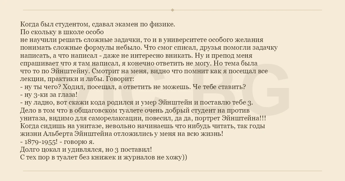 Когда был студентом, сдавал экамен по физике. По скольку в школе особо не научили решать сложные задачки, то и в университете особого желания понимать сложные формулы небыло. Что смог списал, друзья помогли задачку написать, а что написал - даже не интересно вникать. Ну и препод меня спрашивает что я там написал, я конечно ответить не могу. Но тема была что то по Эйнштейну. Смотрит на меня, видно что помнит как я посещал все лекции, практики и лабы. Говорит: - ну ты чего? Ходил, посещал, а ответить не можешь. Че тебе ставить? - ну 3-ки за глаза! - ну ладно, вот скажи кода родился и умер Эйнштейн и поставлю тебе 3. Дело в том что в общаговском туалете очень добрый студент на против унитаза, видимо для саморелаксации, повесил, да да, портрет Эйнштейна!!! Когда сидишь на унитазе, невольно начинаешь что нибудь читать, так годы жизни Альберта Эйнштейна отложились у меня на всю жизнь! - 1879-1955! - говорю я. Долго цокал и удивлялся, но 3 поставил! С тех пор в туалет без книжек и журналов не хожу))