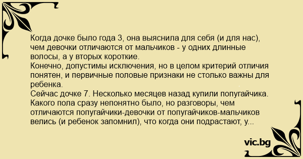 Сейчас дочке 7. Несколько месяцев назад купили попугайчика. Какого пола сразу непонятно было, но разговоры, чем отличаются попугайчики-девочки от попугайчиков-мальчиков велись (и ребенок запомнил), что когда они подрастают, у мальчиков клювик становится синим, а у девочек розовым. Наш попугайчик оказался мальчиком (клювик посинел), а спустя несколько месяцев разговор повторился, с последующим переходом на людей: