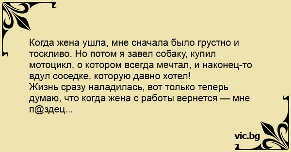 Когда жена ушла, мне сначала было грустно и тоскливо. Но потом я завел собаку, купил мотоцикл, о котором всегда мечтал, и наконец-то вдул соседке, которую давно хотел!