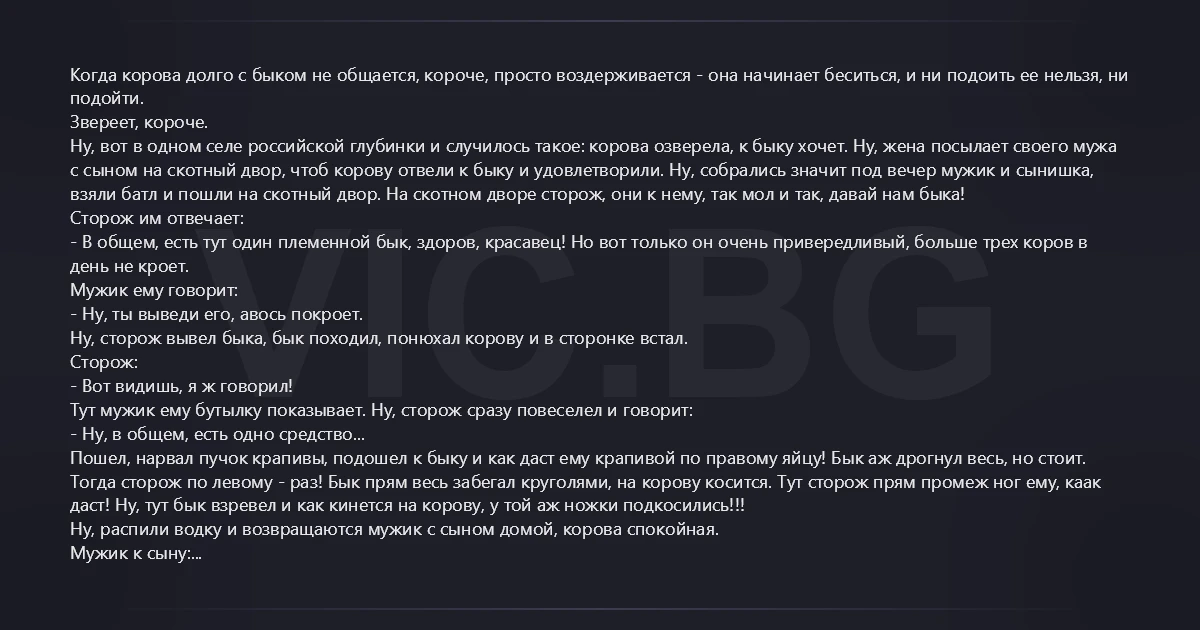 Ну, вот в одном селе российской глубинки и случилось такое: корова озверела, к быку хочет. Ну, жена посылает своего мужа с сыном на скотный двор, чтоб корову отвели к быку и удовлетворили. Ну, собрались значит под вечер мужик и сынишка, взяли батл и пошли на скотный двор. На скотном дворе сторож, они к нему, так мол и так, давай нам быка!