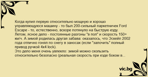 Летом, ясное дело - постоянные разгоны "в пол" и скорость 150+ км/ч. А зимой родилась другая забава: оказалось, что Эскейп 2002 года отлично гонял по снегу в заносах (если "залочить" полный привод ручкой 4х4 lock).