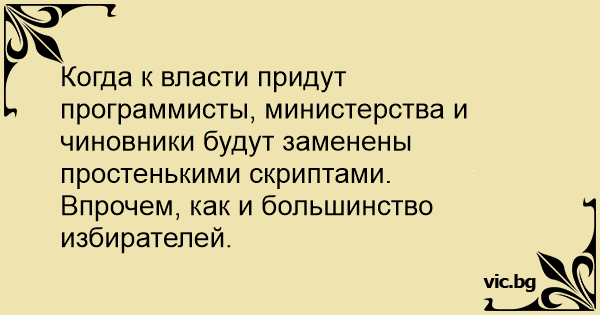 Когда к власти придут программисты, министерства и чиновники будут заменены простенькими скриптами.