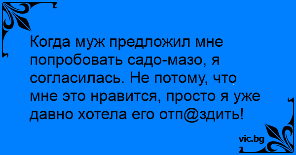 Когда муж предложил мне попробовать садо-мазо, я согласилась. Не потому, что мне это нравится, просто я уже давно хотела его отп@здить!