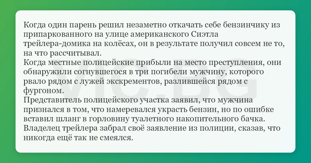 Когда один парень решил незаметно откачать себе бензинчику из припаркованного на улице американского Сиэтла трейлера-домика на колёсах, он в результате получил совсем не то, на что рассчитывал.