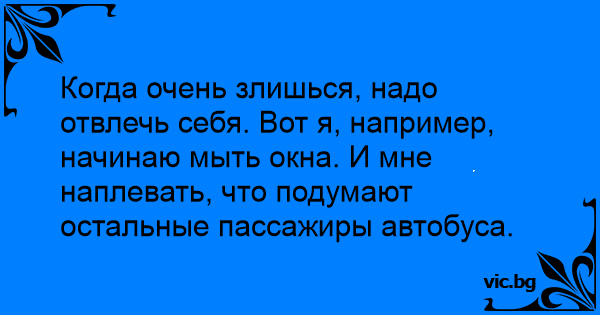 Когда очень злишься, надо отвлечь себя. Вот я, например, начинаю мыть окна. И мне наплевать, что подумают остальные пассажиры автобуса.