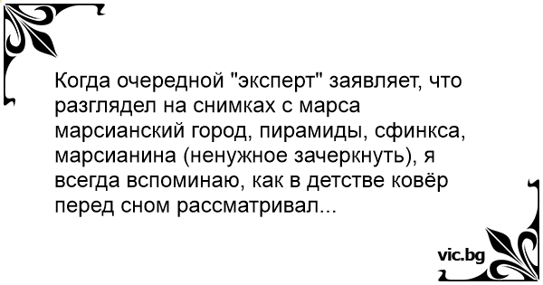Когда очередной "эксперт" заявляет, что разглядел на снимках с марса марсианский город, пирамиды, сфинкса, марсианина (ненужное зачеркнуть), я всегда вспоминаю, как в детстве ковёр перед сном рассматривал...