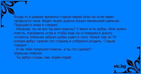 - Мальчик, ты не мог бы мне помочь? У меня есть рубль. Мне нужно поесть, покормить осла и чтобы ещё на оставшуюся дорогу осталось.Мальчик забрал рубль ушёл в село. Купил там за 10 копеек арбуз, принёс его старику и собрался уходить. Старик говорит: