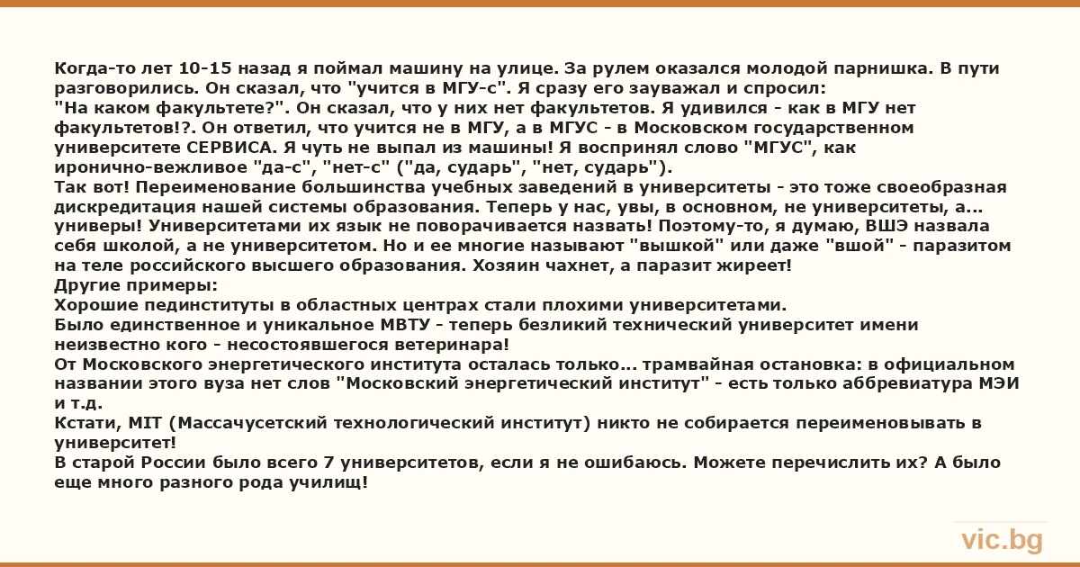 Так вот! Переименование большинства учебных заведений в университеты - это тоже своеобразная дискредитация нашей системы образования. Теперь у нас, увы, в основном, не университеты, а... универы! Университетами их язык не поворачивается назвать! Поэтому-то, я думаю, ВШЭ назвала себя школой, а не университетом. Но и ее многие называют "вышкой" или даже "вшой" - паразитом на теле российского высшего образования. Хозяин чахнет, а паразит жиреет!