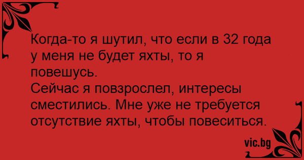 Сейчас я повзрослел, интересы сместились. Мне уже не требуется отсутствие яхты, чтобы повеситься.