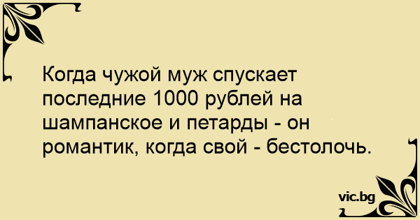 Когда чужой муж спускает последние 1000 рублей на шампанское и петарды - он романтик, когда свой - бестолочь.