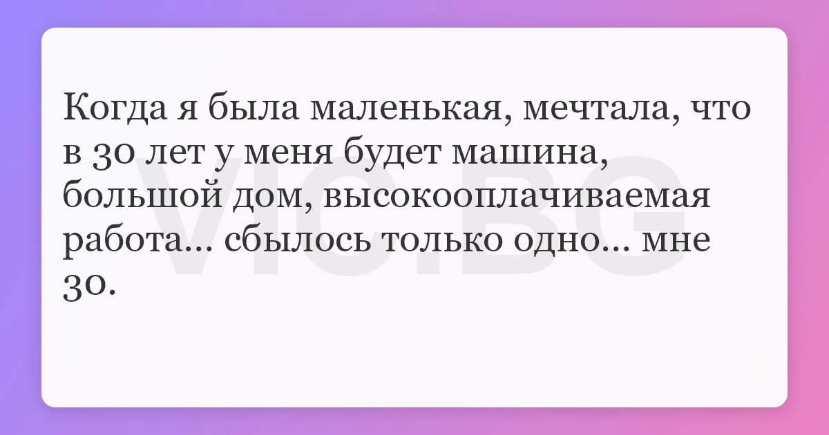 Когда я была маленькая, мечтала, что в 30 лет у меня будет машина, большой дом, высокооплачиваемая работа… сбылось только одно… мне 30.