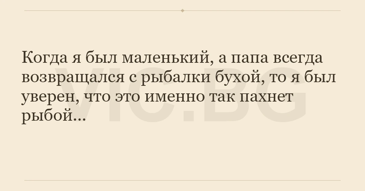 Когда я был маленький, а папа всегда возвращался с рыбалки бухой, то я был уверен, что это именно так пахнет рыбой...