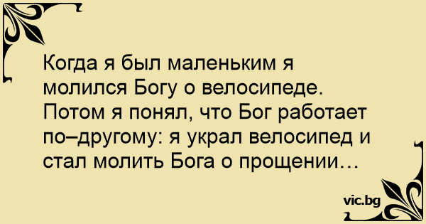 Потом я понял, что Бог работает по–другому: я украл велосипед и стал молить Бога о прощении…