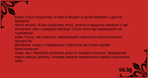 Когда я был студентом, то жил в общаге в одной комнате с другом Валерой.