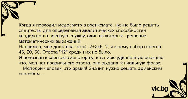 Когда я проходил медосмотр в военкомате, нужно было решить спецтесты для определения аналитических способностей кандидата на военную службу, один из которых - решение математических выражений. Например, мне достался такой: 2+2х5=?, и к нему набор ответов: 45, 20, 50. Ответа "12" среди них не было. Я подозвал к себе экзаменаторшу, и на мою удивлённую реакцию, что, мол нет правильного ответа, она выдала гениальную фразу: - Молодой человек, это армия! Значит, нужно решать армейским способом. Ответ: 20.