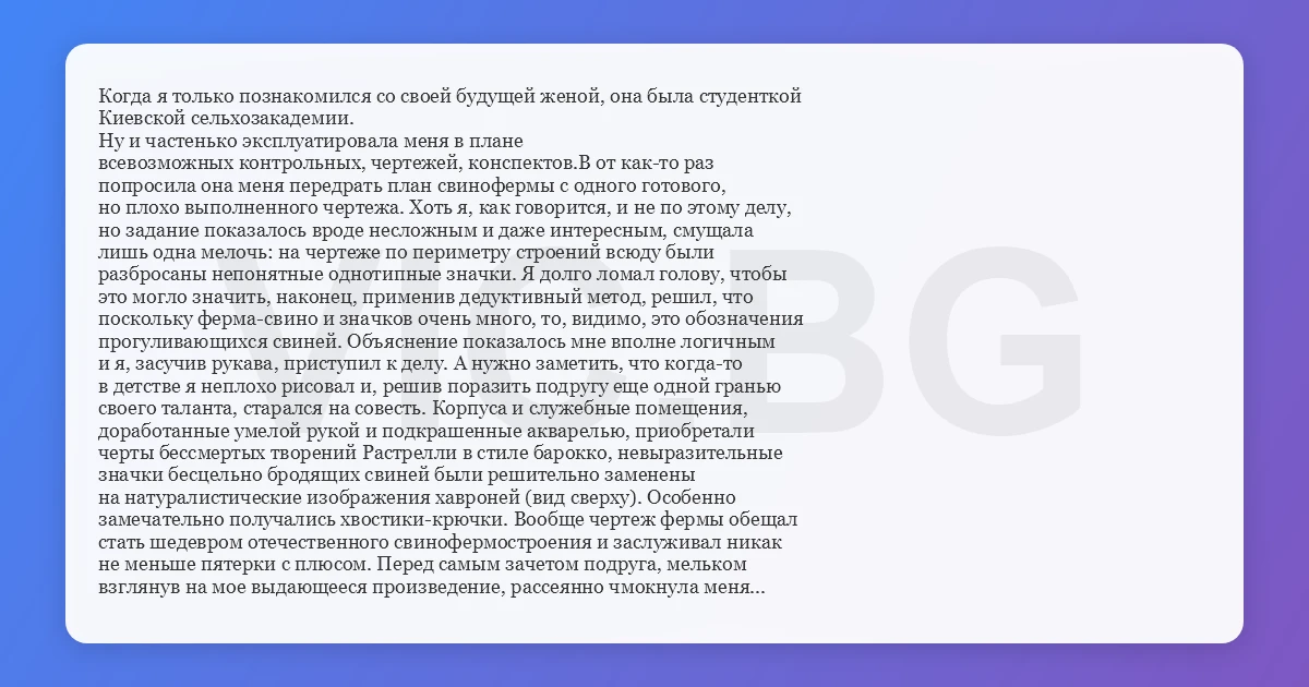 Когда я только познакомился со своей будущей женой, она была студенткой Киевской сельхозакадемии. Ну и частенько эксплуатировала меня в плане всевозможных контрольных, чертежей, конспектов.В от как-то раз попросила она меня передрать план свинофермы с одного готового, но плохо выполненного чертежа. Хоть я, как говорится, и не по этому делу, но задание показалось вроде несложным и даже интересным, смущала лишь одна мелочь: на чертеже по периметру строений всюду были разбросаны непонятные однотипные значки. Я долго ломал голову, чтобы это могло значить, наконец, применив дедуктивный метод, решил, что поскoльку ферма-свино и значков очень много, то, видимо, это обозначения прогуливающихся свиней. Объяснение показалось мне вполне логичным и я, засучив рукава, приступил к делу. А нужно заметить, что когда-то в детстве я неплохо рисовал и, решив поразить подругу еще одной гранью своего таланта, старался на совесть. Корпуса и служебные помещения, доработанные умелой рукой и подкрашенные акварелью, приобретали черты бессмертых творений Растрелли в стиле барокко, невыразительные значки бесцельно бродящих свиней были решительно заменены на натуралистические изображения хавроней (вид сверху). Особенно замечательно получались хвостики-крючки. Вообще чертеж фермы обещал стать шедевром отечественного свинофермостроения и заслуживал никак не меньше пятерки с плюсом. Перед самым зачетом подруга, мельком взглянув на мое выдающееся произведение, рассеянно чмокнула меня в щеку и умчалась в академию. Вечером мы встретились. Девушка выглядела как-то странно. - Ну как, что сказал препод? - предвкушая шквал восторгов и похвал, спросил я. - Сказал, что никогда в жизни не видел, чтобы одному человеку подсунули сразу столько свиней. - Не понял, - опешил я. - Идиot, то, что ты нарисовал в виде свиней - это обозначения деревьев и кустарников...