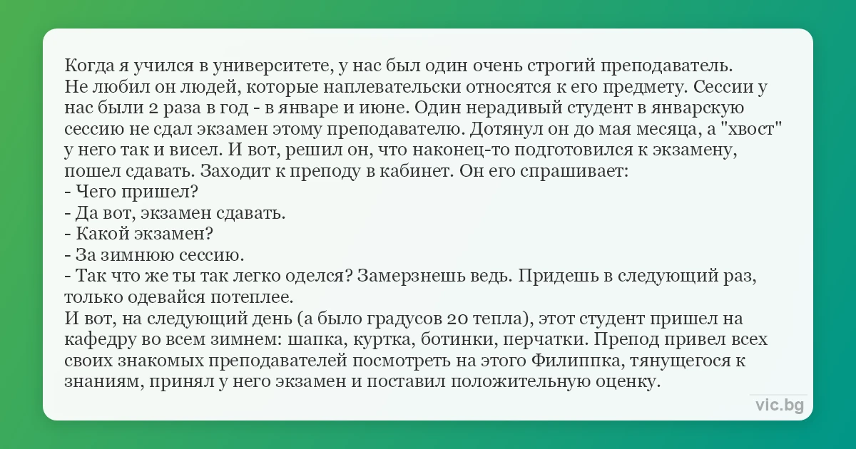 Когда я учился в университете, у нас был один очень строгий преподаватель. Не любил он людей, которые наплевательски относятся к его предмету. Сессии у нас были 2 раза в год - в январе и июне. Один нерадивый студент в январскую сессию не сдал экзамен этому преподавателю. Дотянул он до мая месяца, а "хвост" у него так и висел. И вот, решил он, что наконец-то подготовился к экзамену, пошел сдавать. Заходит к преподу в кабинет. Он его спрашивает: - Чего пришел? - Да вот, экзамен сдавать. - Какой экзамен? - За зимнюю сессию. - Так что же ты так легко оделся? Замерзнешь ведь. Придешь в следующий раз, только одевайся потеплее. И вот, на следующий день (а было градусов 20 тепла), этот студент пришел на кафедру во всем зимнем: шапка, куртка, ботинки, перчатки. Препод привел всех своих знакомых преподавателей посмотреть на этого Филиппка, тянущегося к знаниям, принял у него экзамен и поставил положительную оценку.