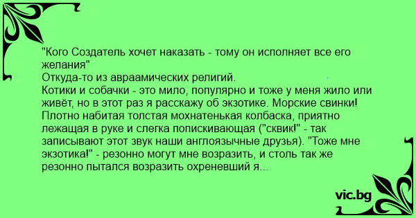 "Кого Создатель хочет наказать - тому он исполняет все его желания" Откуда-то из авраамических религий. Котики и собачки - это мило, популярно и тоже у меня жило или живёт, но в этот раз я расскажу об экзотике. Морские свинки! Плотно набитая толстая мохнатенькая колбаска, приятно лежащая в руке и слегка попискивающая ("сквик!" - так записывают этот звук наши англоязычные друзья). "Тоже мне экзотика!" - резонно могут мне возразить, и столь так же резонно пытался возразить охреневший я ветеринару в далеком году в далеком Монреале. "Не собачка и не кошечка - значит экзотика и всё тут! Тарифы - вон там, на плакатике" - непреклонно возражал бывалый ветеринар с профессиональной улыбкой мастера кастрации... Впрочем, сейчас не об этом. Со зверюгами у меня в эмиграции шло по нарастающей. Я вообще привык иметь дома живность, но то - дома. Тут с той же собакой гулять некогда и негде, коту наполнителя не напасешься со студенческих денег, а самое главное - лендлорды обычно крайне недружелюбно относятся к идее добавить на вписку четвероногого друга. "Ну если душа просит - заведи хомячка или свинку" - посоветовал мне один из местных друзей - "По закону если животное живет в клетке и её не покидает, то запретить его держать нельзя. Предмет личного пользования это вроде как, а не животное". "А что, мысль!" - подумал я и заботливо потопал в ближайший звероприют, где обзавелся шустрой шоколадного цвета с рыжим вкраплением девочкой-свиночкой. Стесняшкой эта девочка не была и с удовольствием обкусывала (весьма впрочем незлобиво) мои пальцы, когда сидела на руках, скакала по клетке и вносила элемент непредсказуемости в простой холостяцкий быт. Полюбила взбираться по мне и прятаться в щетине под шеей, чем дала мне отличную отговорку в плане бритья, кстати. "Свинке одной скучно и тоскливо, ей так нельзя!" - уверенно сообщила мне по телефону моя любимая при следующем разговоре. "Ну нельзя так нельзя..." - пожал плечами я и двинул в уже знакомый приют. А что, клетка есть, жрут они немного - где одна, там и две... Фигушки, где одна, там сразу три. В смысле, что в приюте сидели в клетке уже две свиночки, одна из которых была гладкошерстная и прыгучая, а вторая - перувианская - волосата, как хиппан, и столь же невозмутима. "Они всю жизнь жили вместе, их так вот и принесли, нельзя разлучать..." - старательно объясняла мне девочка-волонтёр, пока я подписывал бумаги. "Вот теперь-то им точно не будет скучно!" - думал я и, как всегда, ошибался. Скучно не было мне. Диспозиция вышла тупиковая: рыже-шоколадная вселилась первой и явно обладала всеми правами на главенство, но новоприбывших было двое, причем пара была слаженная. А вы видели, как дерутся свинки? Узри такое Остап Бендер - и идея дуэли на мясорубках более не прельщала бы его воображение. Дело в том, что животные они довольно мирные, лишённые острых, как бритва, когтей, длинных клыков и прочих боевых атрибутов. По сути морская свинка процентов на 30-40% состоит из головы на крепкой шее, плавно переходящей в туловище. Едальник. Массивная, крепенькая, миленькая голова с глазками бусинками и выразительным носиком... Вот ими-то они и дерутся. Подбежала к сопернице, яростный взмах башкой - бадабум в лобешник! У хиппо-свинки при этом еще очень мило чёлочка подлетала. Шум при этом стоял такой, что казалось будто в атаку идет вся будённовская конница, а не три грызуна-
