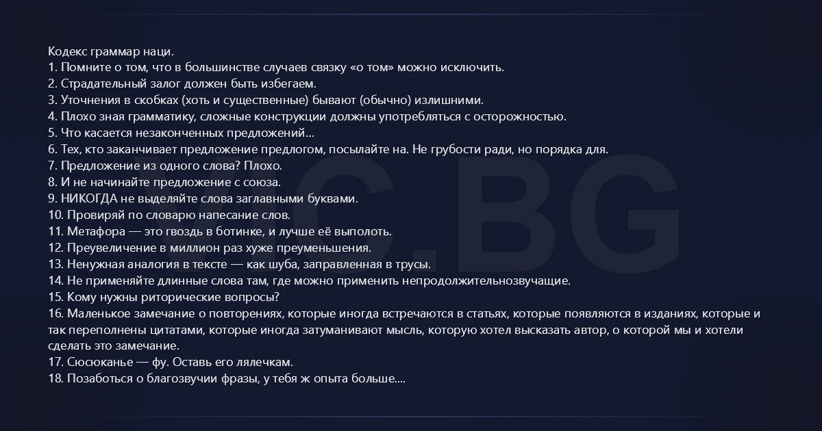 Кодекс граммар наци. 1. Помните о том, что в большинстве случаев связку «о том» можно исключить. 2. Страдательный залог должен быть избегаем. 3. Уточнения в скобках (хоть и существенные) бывают (обычно) излишними. 4. Плохо зная грамматику, сложные конструкции должны употребляться с осторожностью. 5. Что касается незаконченных предложений… 6. Тех, кто заканчивает предложение предлогом, посылайте на. Не грубости ради, но порядка для. 7. Предложение из одного слова? Плохо. 8. И не начинайте предложение с союза. 9. НИКОГДА не выделяйте слова заглавными буквами. 10. Провиряй по словарю напесание слов. 11. Метафора — это гвоздь в ботинке, и лучше её выполоть. 12. Преувеличение в миллион раз хуже преуменьшения. 13. Ненужная аналогия в тексте — как шуба, заправленная в трусы. 14. Не применяйте длинные слова там, где можно применить непродолжительнозвучащие. 15. Кому нужны риторические вопросы? 16. Маленькое замечание о повторениях, которые иногда встречаются в статьях, которые появляются в изданиях, которые и так переполнены цитатами, которые иногда затуманивают мысль, которую хотел высказать автор, о которой мы и хотели сделать это замечание. 17. Сюсюканье — фу. Оставь его лялечкам. 18. Позаботься о благозвучии фразы, у тебя ж опыта больше. 19. Небезинтересно было бы взымать штраф с безолаберных за неверное написание гласных после приставок. 20. Не следует пытаться не избегать двойных отрицаний. 21. Не ставьте два "не" подряд, если это не необходимо. 22. У слова "нет" нету форм изменения. 23. Коллеги обращения надо как-то выделять. 24. Которые являются придаточными предложениями, составлять надо правильно. 25. Мы хотим отметить, что менять лицо, от имени которого ведётся изложение, автор этих строк не рекомендует. 26. Заканчивать предложение местоимением – дурной стиль, не для этого оно. 27. Если неполные конструкции, – плохо. 28. Правило гласит, что "косвенная речь в кавычки не берётся". 29. Числительные до 10-ти включительно лучше писать прописью. 30. Склонять числительные можно сто двадцать пятью способами, но только один из них правильный. 31. Сдержанность изложения – всегда абсолютно самый лучший способ подачи потрясающих идей. 32. Будьте более или менее конкретны. 33. Слов порядок речи стиля не меняет? 34. Это тебе, автор, (нельзя прерывать повествование в неожиданном месте) понятно о чём пойдёт дальше речь, но пожалей людей, не вынуждай перечитывать. 35. Применяя деепричастный оборот всегда выделяйте его запятыми. 36. Ставьте правильные чёрточки-тире длинное, с пробелами, а дефис чуть — чуть покороче, без пробелов. 37. Ответ отрицательный на вопрос о том, ставится ли вопросительный знак в предложении с вопросительной косвенной речью? 38. Повторно повторять все повторяющиеся однокоренные слова – это тавтология – лишнее излишество.