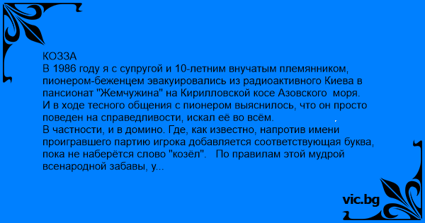 КОЗЗА В 1986 году я с супругой и 10-летним внучатым племянником, пионером-беженцем эвакуировались из радиоактивного Киева в пансионат "Жемчужина" на Кирилловской косе Азовского моря.
