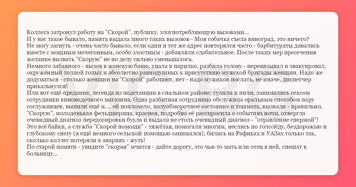 Коллега затронул работу на "Скорой", публику, злоупотребляющую вызовами... И у нас такое бывало, память выдала много таких вызовов - Моя собачка съела виноград, это ничего? Не могу заснуть - очень часто бывало, если один и тот же адрес повторялся часто - барбитураты давались вместе с мощным мочегонным, особо злостным - добавляли слабительное. После таких мер пресечения желание вызвать "Скорую" не по делу сильно уменьшалось. Немного забавного - вызов в женскую баню, упала в парилке, разбила голову - перевязывал и эвакуировал, окружённый толпой голых и абсолютно равнодушных к присутствию мужской бригады женщин. Надо же додуматься - столько женщин на "Скорой" работают, нет - надо мужиков послать, не иначе, диспетчер прикальнулся! Или вот ещё предание, легенда из подстанции в спальном районе: гуляли и пили, занимались сексом сотрудники виноводочного магазина. Одна разбитная сотрудница обслужила оральным способом пару сослуживцев, выпили ещё и.... ей поплохело, полуобморочное состояние и тошнота, вызвали - правильно, "Скорую", молоденькая фельдшерица, краснея, подробно её расспросила о событиях ночи, отвергла очевидный диагноз передозировки бухла и выдала не столь очевидный диагноз - "отравление спермой"! Это всё байки, а служба "Скорой помощи" - тяжёлая, помогали многим, неслись по гололёду, бездорожью и глубокому снегу (я ещё немного сельской помощью занимался), бились на Рафиках и УАЗах только так, сколько коллег потеряли в авариях - жуть! По старой памяти - увидите "скорая" мчится - дайте дорогу, это чья-то мать или отец в ней, спешат в больницу...