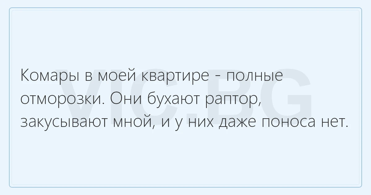 Комары в моей квартире - полные отморозки. Они бухают раптор, закусывают мной, и у них даже поноса нет.