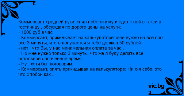 - Коммерсант, прикидывает на калькуляторе: мне нужно на все про все 3 минуты, итого получается я тебе должен 50 рублей
