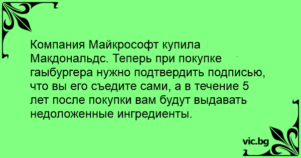 Компания Майкрософт купила Макдональдс. Теперь при покупке гаыбургера нужно подтвердить подписью, что вы его съедите сами, а в течение 5 лет после покупки вам будут выдавать недоложенные ингредиенты.