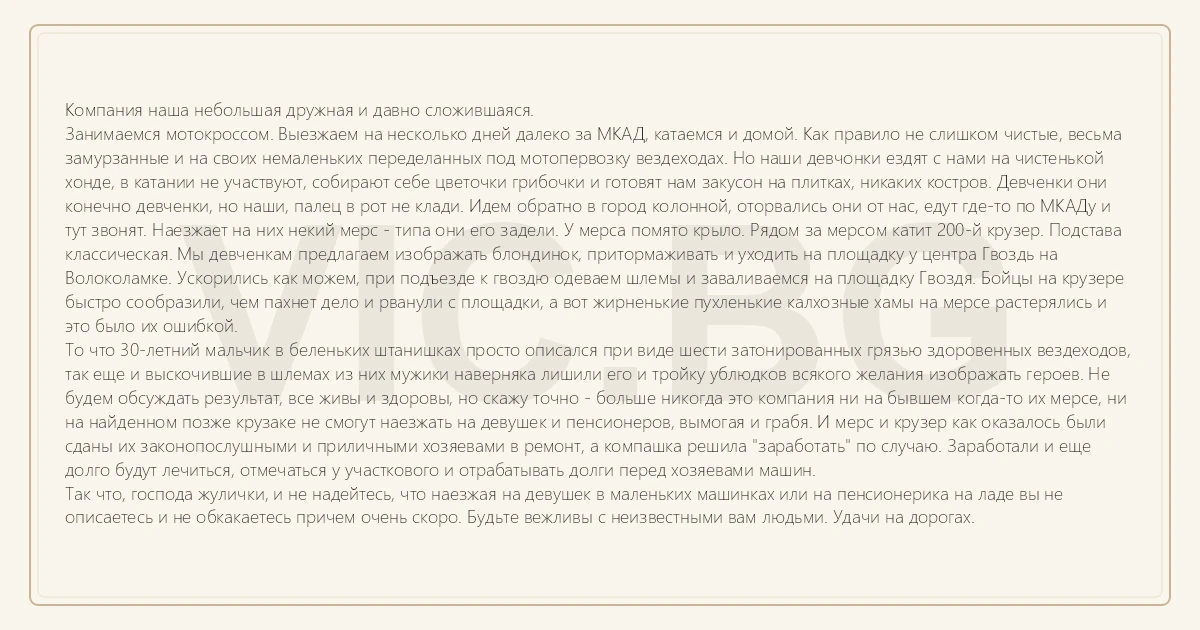 Компания наша небольшая дружная и давно сложившаяся. Занимаемся мотокроссом. Выезжаем на несколько дней далеко за МКАД, катаемся и домой. Как правило не слишком чистые, весьма замурзанные и на своих немаленьких переделанных под мотопервозку вездеходах. Но наши девчонки ездят с нами на чистенькой хонде, в катании не участвуют, собирают себе цветочки грибочки и готовят нам закусон на плитках, никаких костров. Девченки они конечно девченки, но наши, палец в рот не клади. Идем обратно в город колонной, оторвались они от нас, едут где-то по МКАДу и тут звонят. Наезжает на них некий мерс - типа они его задели. У мерса помято крыло. Рядом за мерсом катит 200-й крузер. Подстава классическая. Мы девченкам предлагаем изображать блондинок, притормаживать и уходить на площадку у центра Гвоздь на Волоколамке. Ускорились как можем, при подъезде к гвоздю одеваем шлемы и заваливаемся на площадку Гвоздя. Бойцы на крузере быстро сообразили, чем пахнет дело и рванули с площадки, а вот жирненькие пухленькие калхозные хамы на мерсе растерялись и это было их ошибкой. То что 30-летний мальчик в беленьких штанишках просто описался при виде шести затонированных грязью здоровенных вездеходов, так еще и выскочившие в шлемах из них мужики наверняка лишили его и тройку ублюдков всякого желания изображать героев. Не будем обсуждать результат, все живы и здоровы, но скажу точно - больше никогда это компания ни на бывшем когда-то их мерсе, ни на найденном позже крузаке не смогут наезжать на девушек и пенсионеров, вымогая и грабя. И мерс и крузер как оказалось были сданы их законопослушными и приличными хозяевами в ремонт, а компашка решила "заработать" по случаю. Заработали и еще долго будут лечиться, отмечаться у участкового и отрабатывать долги перед хозяевами машин. Так что, господа жулички, и не надейтесь, что наезжая на девушек в маленьких машинках или на пенсионерика на ладе вы не описаетесь и не обкакаетесь причем очень скоро. Будьте вежливы с неизвестными вам людьми. Удачи на дорогах.