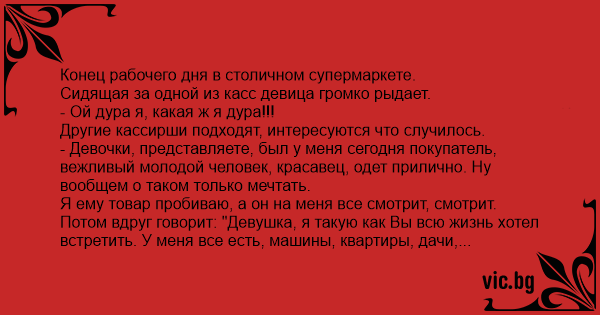 - Девочки, представляете, был у меня сегодня покупатель, вежливый молодой человек, красавец, одет прилично. Ну вообщем о таком только мечтать.